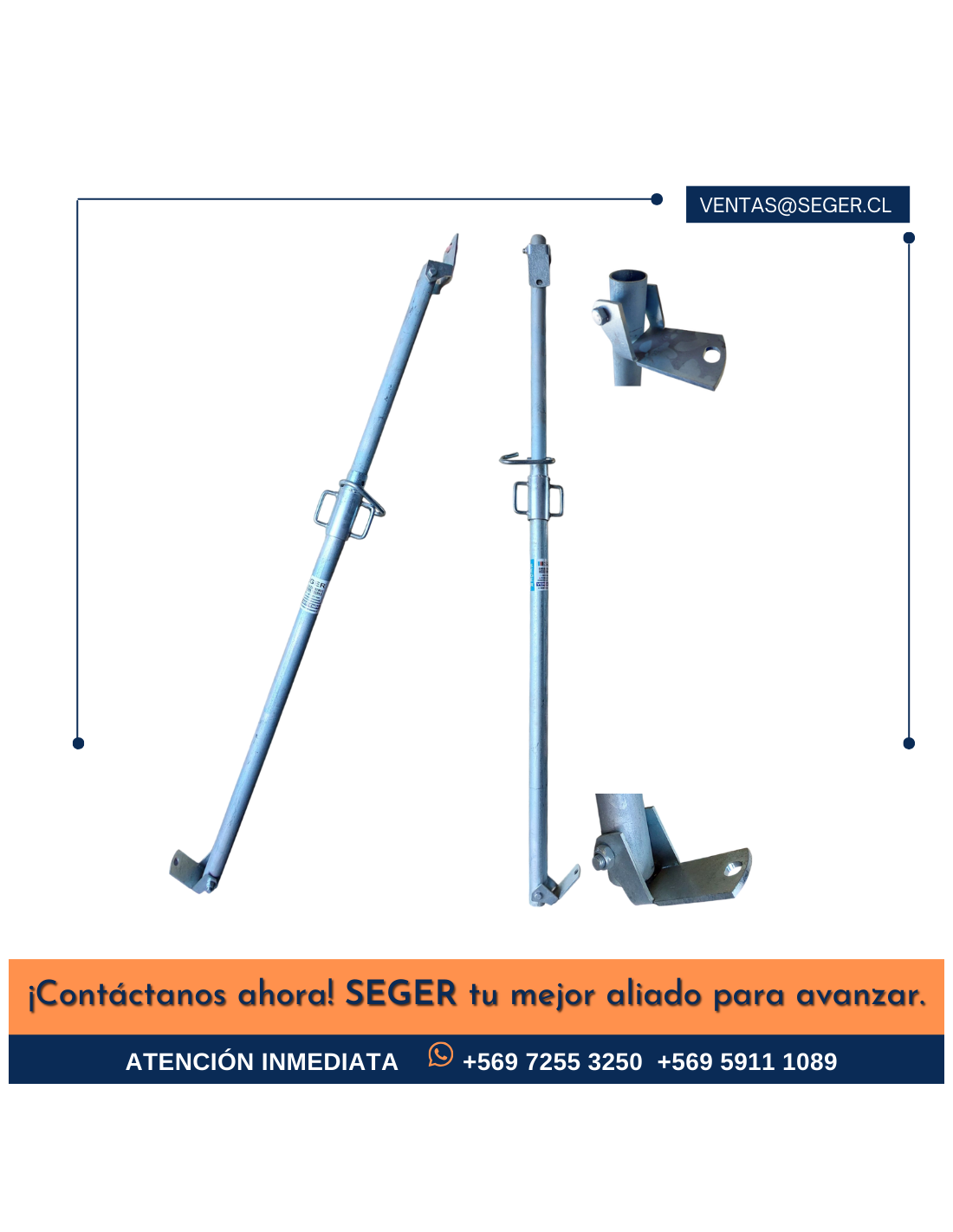 Empleado para aplome y estabilización de panel para moldaje, son de fácil adaptabilidad a las distintas pendientes de apoyo, con una distancia entre perforaciones de 100 mm para una primera regulación fine del mismo recorrido. Cabezal inferior y superior articulado con perforación para pasa hilo 15/17mm para acople con tuerca plato o hexagonal.